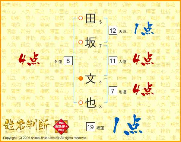 生活面を象徴する運勢です。外部から受ける影響力を表し、結婚運、家庭運や職場、環境への順応性を表します。総運から人運を引いた画数。姓や名が1文字の場合を除く。