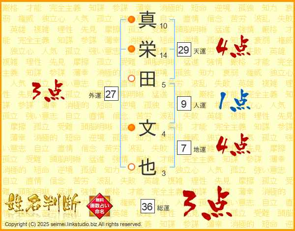 真(10画)栄(14画)田(5画) 文(4画)也(3画)