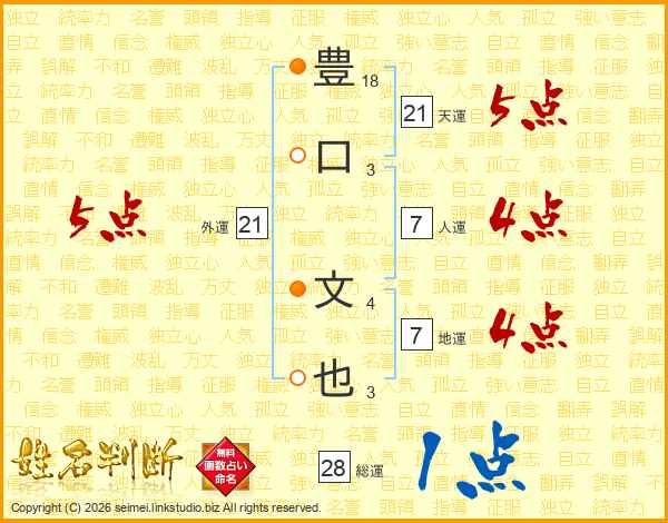 豊(18画)口(3画) 文(4画)也(3画)