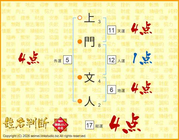 生活面を象徴する運勢です。外部から受ける影響力を表し、結婚運、家庭運や職場、環境への順応性を表します。総運から人運を引いた画数。姓や名が1文字の場合を除く。