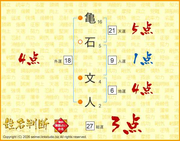 亀(16画)石(5画) 文(4画)人(2画)