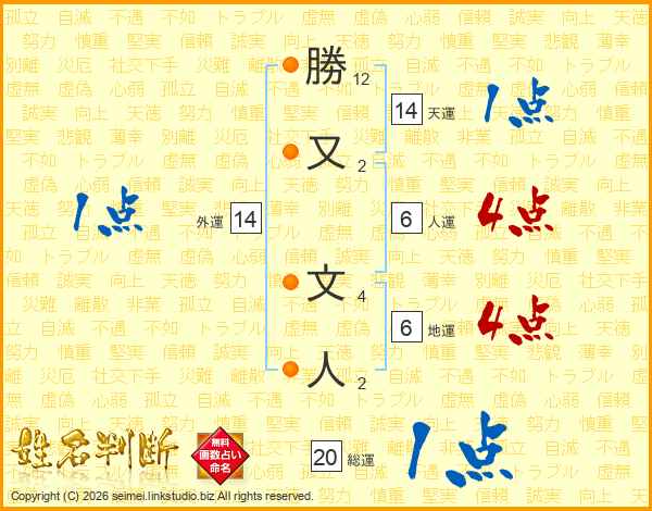 生活面を象徴する運勢です。外部から受ける影響力を表し、結婚運、家庭運や職場、環境への順応性を表します。総運から人運を引いた画数。姓や名が1文字の場合を除く。