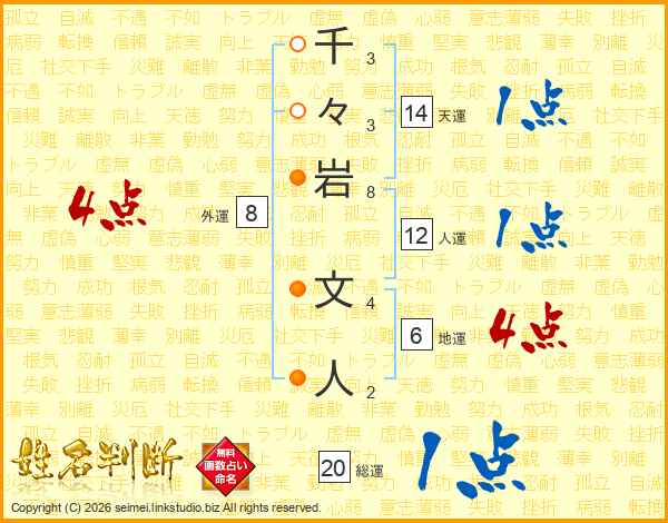 生活面を象徴する運勢です。外部から受ける影響力を表し、結婚運、家庭運や職場、環境への順応性を表します。総運から人運を引いた画数。姓や名が1文字の場合を除く。