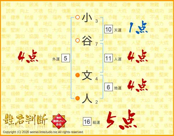 あなたの人生を表す1番重要な運勢です。生涯を通じて影響する総合運となり、主に50歳以降の晩年期に影響を及ぼします。苗字と名前の合計画数。