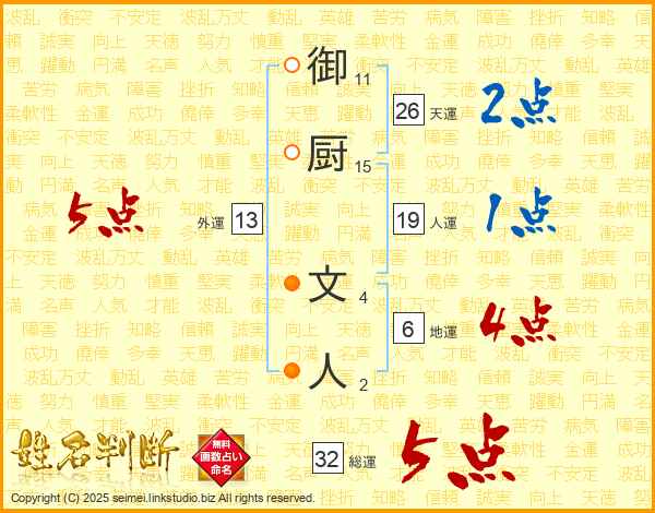 生活面を象徴する運勢です。外部から受ける影響力を表し、結婚運、家庭運や職場、環境への順応性を表します。総運から人運を引いた画数。姓や名が1文字の場合を除く。