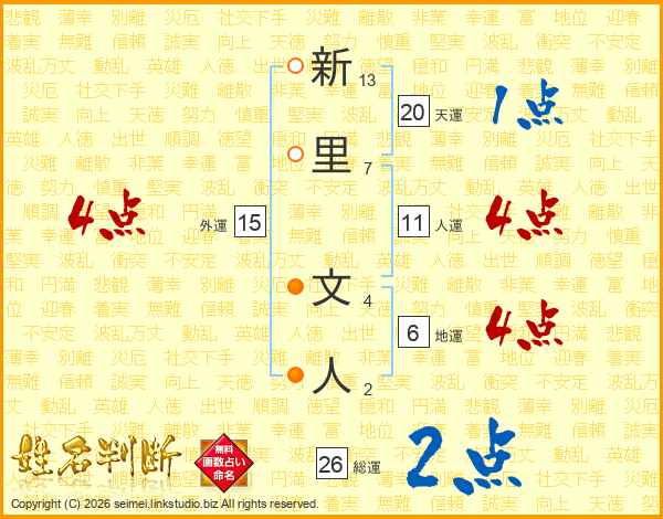新里文人さんの総運は26画の2点!