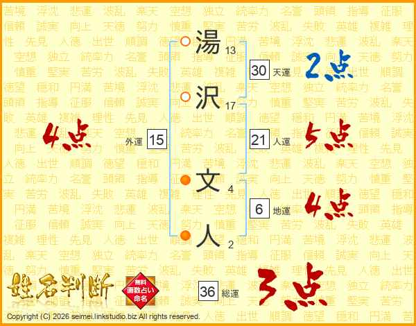 湯(13画)沢(17画) 文(4画)人(2画)