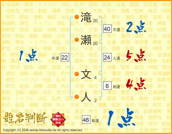 滝(20画)瀬(20画) 文(4画)人(2画)