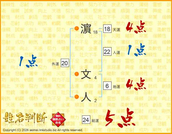 あなたの人生を表す1番重要な運勢です。生涯を通じて影響する総合運となり、主に50歳以降の晩年期に影響を及ぼします。苗字と名前の合計画数。