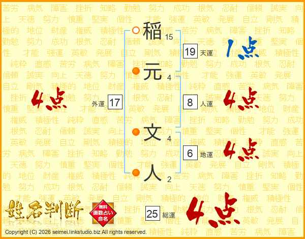 生活面を象徴する運勢です。外部から受ける影響力を表し、結婚運、家庭運や職場、環境への順応性を表します。総運から人運を引いた画数。姓や名が1文字の場合を除く。