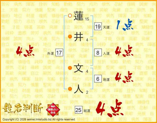 生活面を象徴する運勢です。外部から受ける影響力を表し、結婚運、家庭運や職場、環境への順応性を表します。総運から人運を引いた画数。姓や名が1文字の場合を除く。