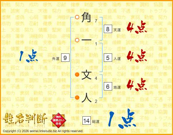 生活面を象徴する運勢です。外部から受ける影響力を表し、結婚運、家庭運や職場、環境への順応性を表します。総運から人運を引いた画数。姓や名が1文字の場合を除く。