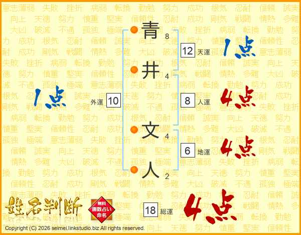 あなたの人生を表す1番重要な運勢です。生涯を通じて影響する総合運となり、主に50歳以降の晩年期に影響を及ぼします。苗字と名前の合計画数。
