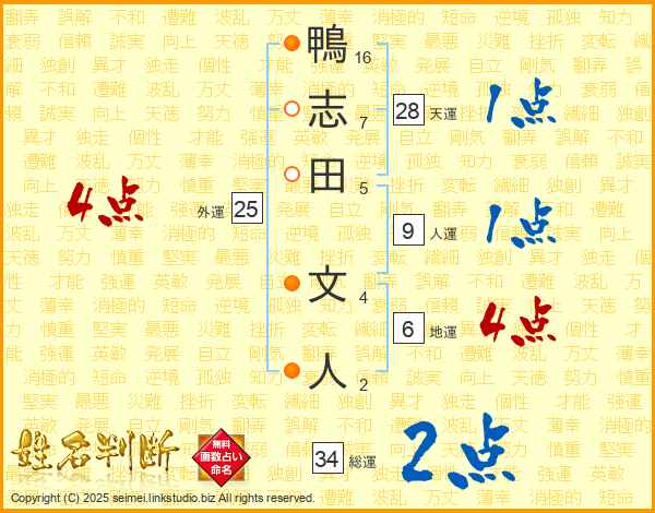 鴨(16画)志(7画)田(5画) 文(4画)人(2画)