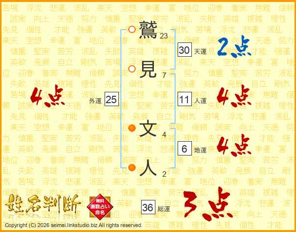 鷲(23画)見(7画) 文(4画)人(2画)