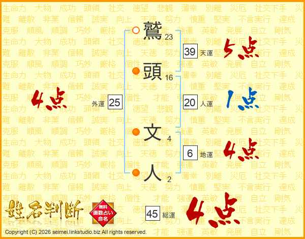 鷲(23画)頭(16画) 文(4画)人(2画)