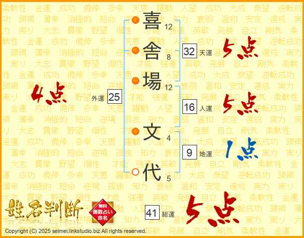 喜(12画)舎(8画)場(12画) 文(4画)代(5画)