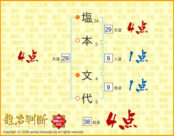 あなたの人生を表す1番重要な運勢です。生涯を通じて影響する総合運となり、主に50歳以降の晩年期に影響を及ぼします。苗字と名前の合計画数。