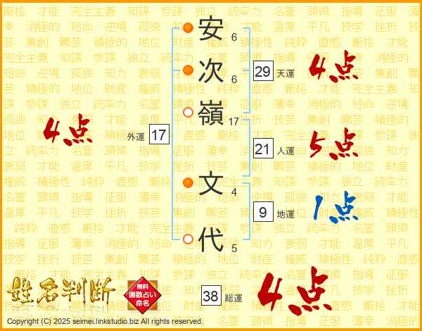 安(6画)次(6画)嶺(17画) 文(4画)代(5画)
