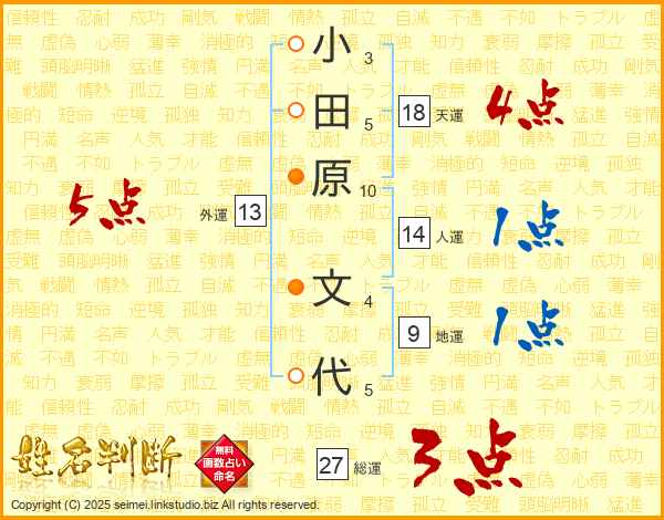 生活面を象徴する運勢です。外部から受ける影響力を表し、結婚運、家庭運や職場、環境への順応性を表します。総運から人運を引いた画数。姓や名が1文字の場合を除く。