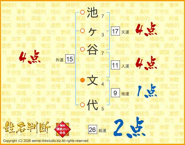 池(7画)ヶ(3画)谷(7画) 文(4画)代(5画)