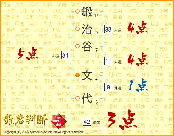 鍛(17画)治(9画)谷(7画) 文(4画)代(5画)