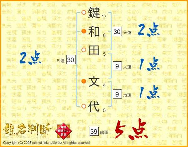 鍵(17画)和(8画)田(5画) 文(4画)代(5画)