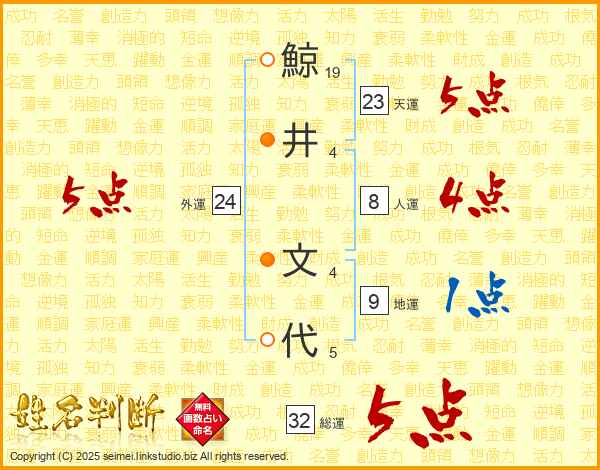あなたの人生を表す1番重要な運勢です。生涯を通じて影響する総合運となり、主に50歳以降の晩年期に影響を及ぼします。苗字と名前の合計画数。