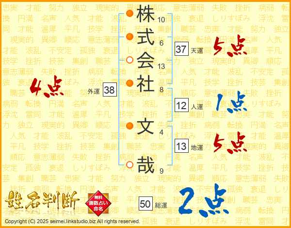株(10画)式(6画)会(13画)社(8画) 文(4画)哉(9画)