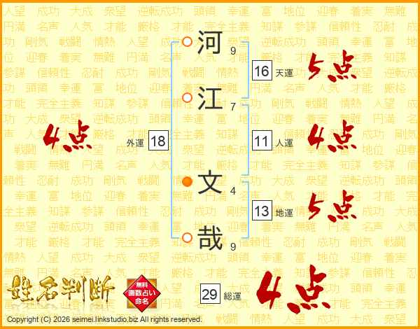 あなたの人生を表す1番重要な運勢です。生涯を通じて影響する総合運となり、主に50歳以降の晩年期に影響を及ぼします。苗字と名前の合計画数。