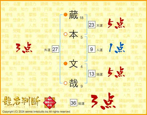 蔵(18画)本(5画) 文(4画)哉(9画)