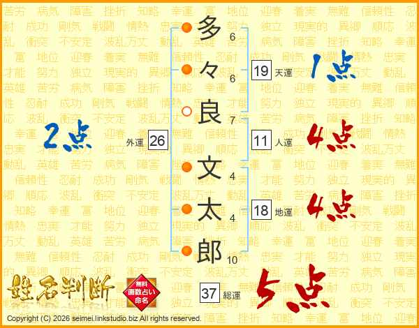 多(6画)々(6画)良(7画) 文(4画)太(4画)郎(10画)