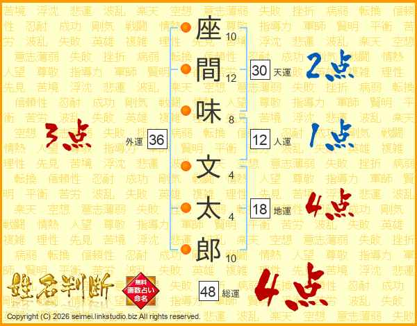 座(10画)間(12画)味(8画) 文(4画)太(4画)郎(10画)