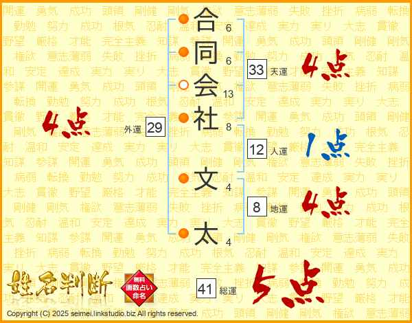 合(6画)同(6画)会(13画)社(8画) 文(4画)太(4画)