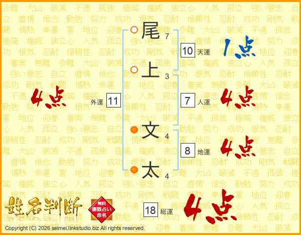 生活面を象徴する運勢です。外部から受ける影響力を表し、結婚運、家庭運や職場、環境への順応性を表します。総運から人運を引いた画数。姓や名が1文字の場合を除く。