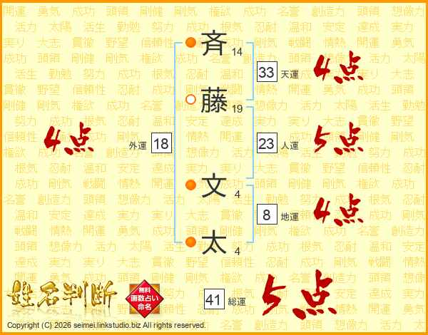 斉(14画)藤(19画) 文(4画)太(4画)
