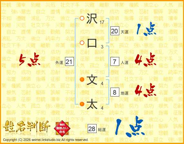 生活面を象徴する運勢です。外部から受ける影響力を表し、結婚運、家庭運や職場、環境への順応性を表します。総運から人運を引いた画数。姓や名が1文字の場合を除く。