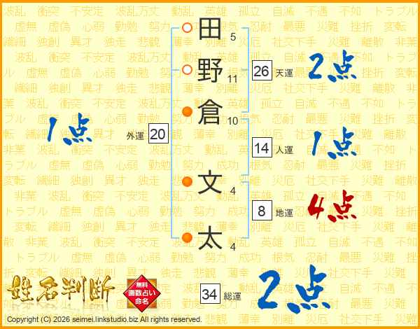 生活面を象徴する運勢です。外部から受ける影響力を表し、結婚運、家庭運や職場、環境への順応性を表します。総運から人運を引いた画数。姓や名が1文字の場合を除く。