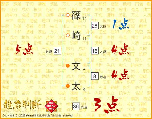 生活面を象徴する運勢です。外部から受ける影響力を表し、結婚運、家庭運や職場、環境への順応性を表します。総運から人運を引いた画数。姓や名が1文字の場合を除く。