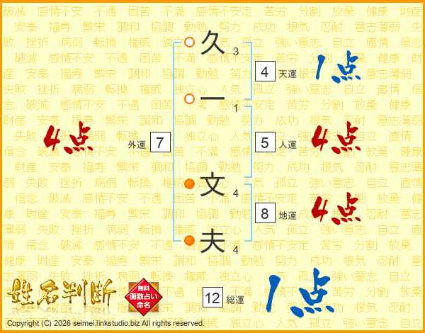 生活面を象徴する運勢です。外部から受ける影響力を表し、結婚運、家庭運や職場、環境への順応性を表します。総運から人運を引いた画数。姓や名が1文字の場合を除く。