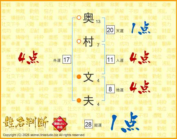奥(13画)村(7画) 文(4画)夫(4画)