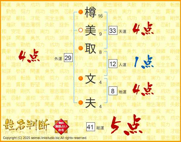 樽(16画)美(9画)取(8画) 文(4画)夫(4画)