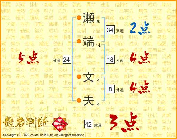 瀬端文夫さんの天運は34画の2点!