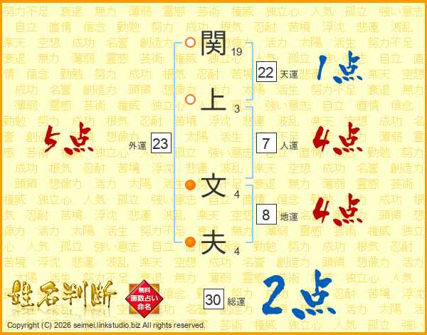 生活面を象徴する運勢です。外部から受ける影響力を表し、結婚運、家庭運や職場、環境への順応性を表します。総運から人運を引いた画数。姓や名が1文字の場合を除く。