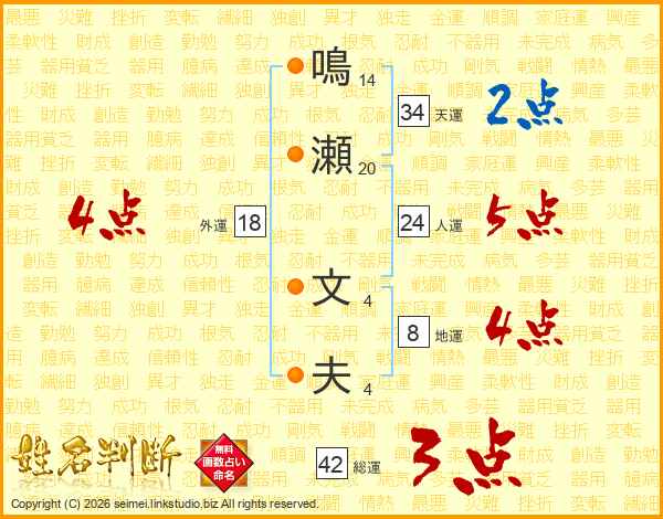 鳴(14画)瀬(20画) 文(4画)夫(4画)