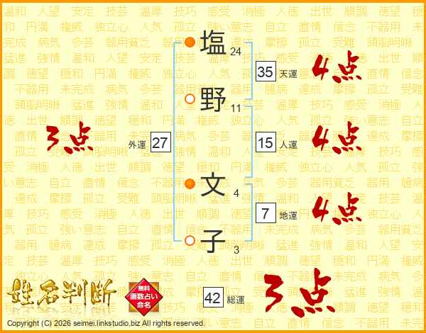 塩(24画)野(11画) 文(4画)子(3画)