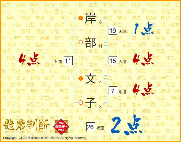 生活面を象徴する運勢です。外部から受ける影響力を表し、結婚運、家庭運や職場、環境への順応性を表します。総運から人運を引いた画数。姓や名が1文字の場合を除く。