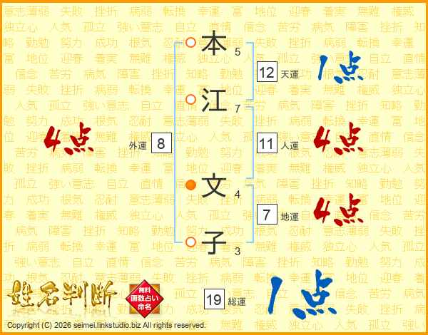 画数の奇数(○陽)と偶数(●陰)の配列で吉凶を占います。どちらかにかたよる名前は大凶名で避ける必要があります。画数の奇数偶数。