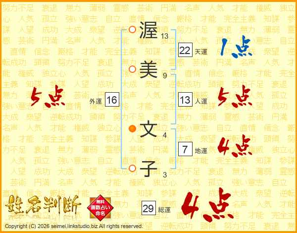 渥(13画)美(9画) 文(4画)子(3画)