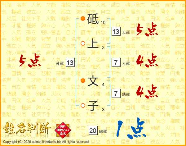 砥上文子さんの天運は13画の5点!